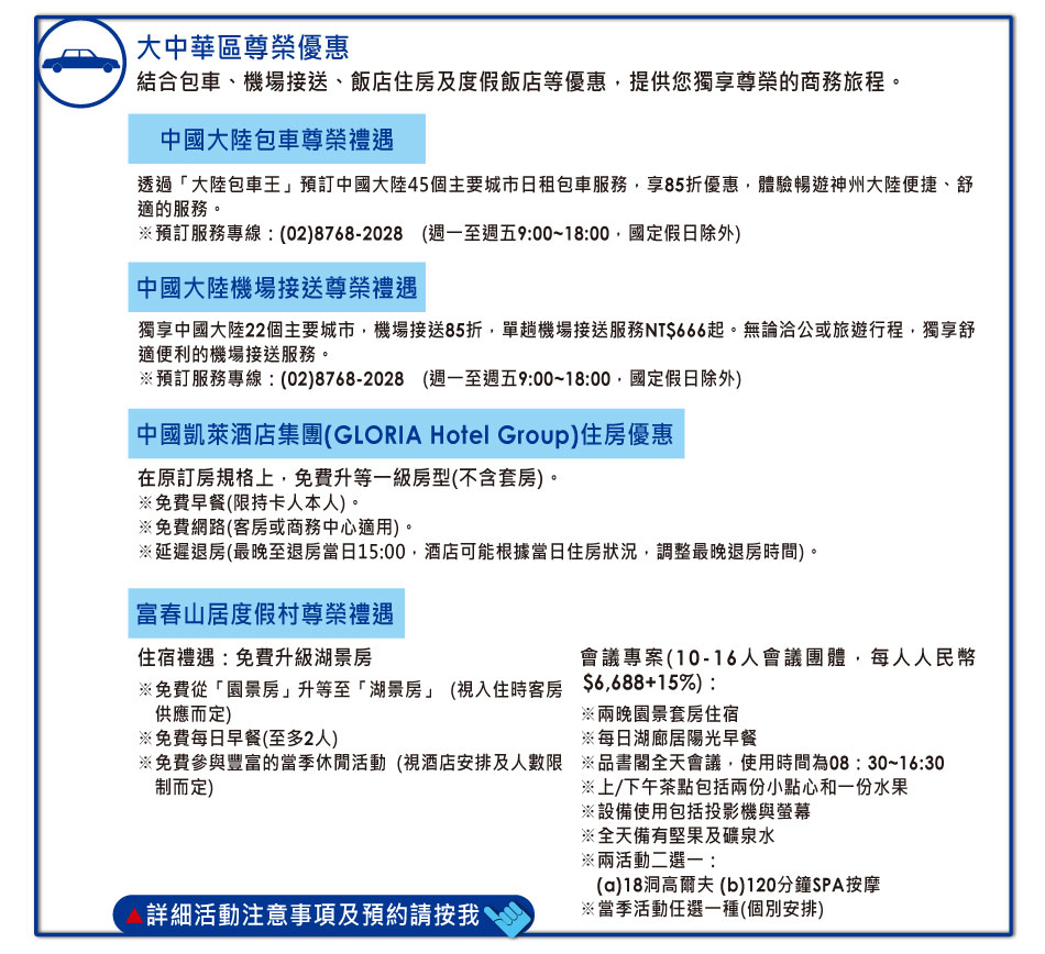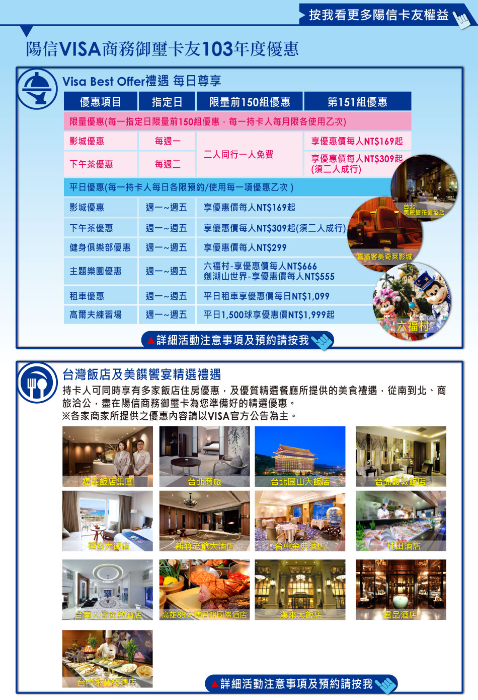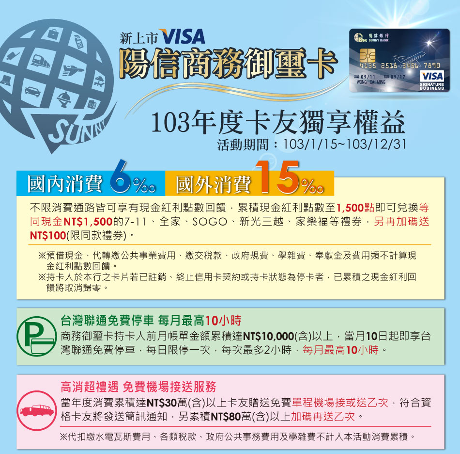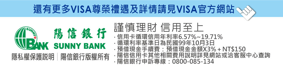 陽信商務御璽卡卡友專屬權益 Visa Best Offer禮遇 每日尊享 台灣飯店及美饌饗宴精選禮遇 高爾夫擊球優惠 獨享租車禮遇 Visa大中華區頂級尊榮禮遇 VISA商務御璽卡官方網頁 陽信銀行首頁 隱私權保護說明