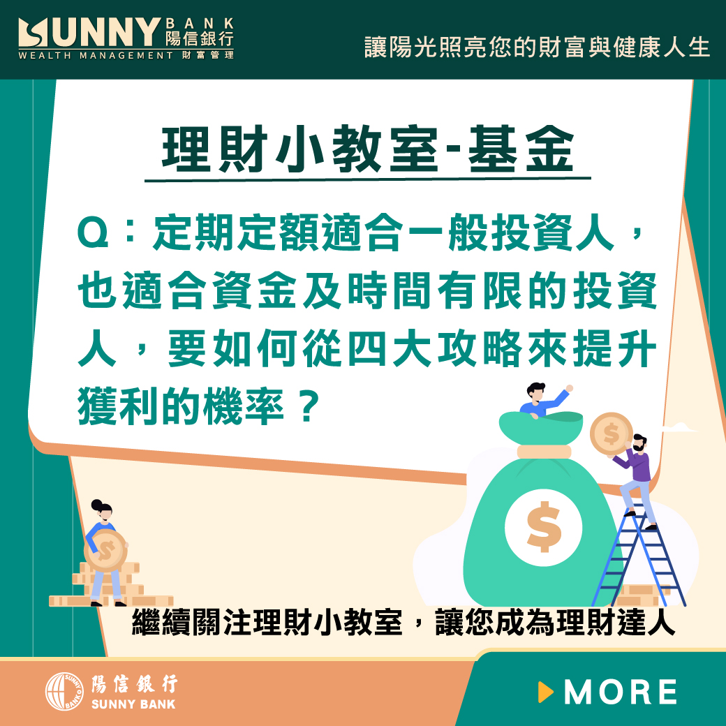 - 理財小教室-Q:定期定額適合一般投資人,也適合資金及時間有限的投資人,要如何從四大攻略來提升獲利的機率?