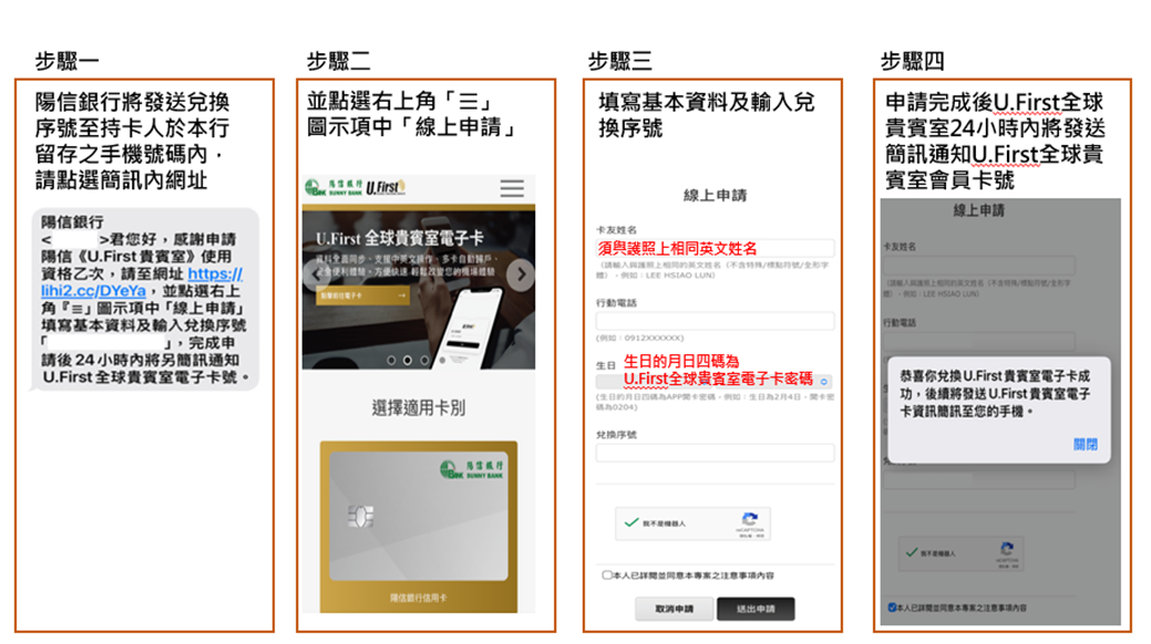 持卡人收到兌換序號簡訊後,請點選簡訊內網址後進入陽信銀行卡友尊享U.First全球貴賓室專案,並點選右上角「☰」圖示項中「線上申請」填寫基本資料及輸入兌換序號。