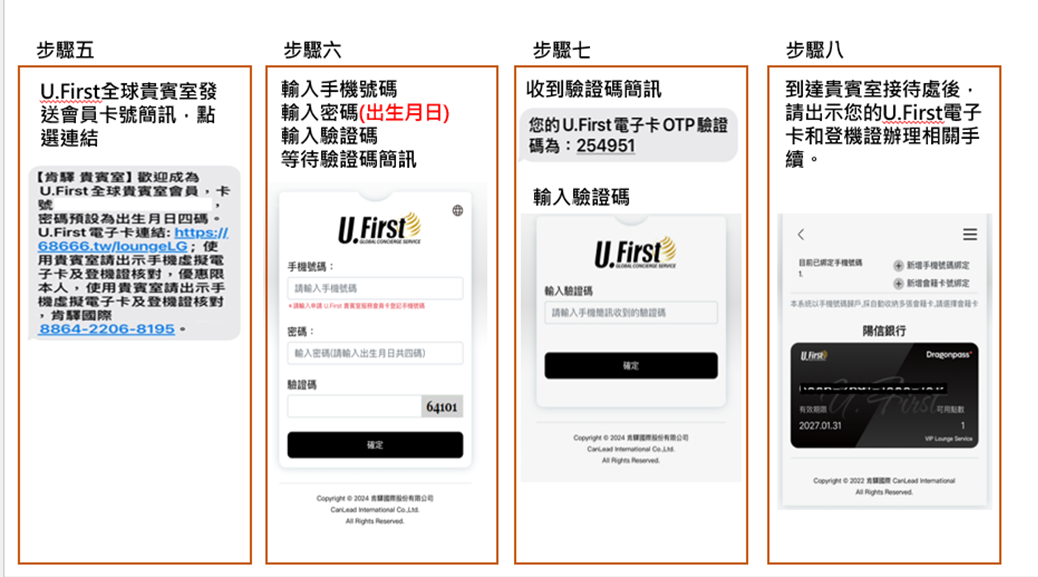 ※請持卡人於手機簡訊收到U.First 全球貴賓室電子會員卡號後,請點選簡訊內U.First 全球貴賓室電子卡登入連結,並登錄註冊時輸入之手機號碼及密碼 (生日的月日4碼) ,進行手機身分驗證後即可啟用U.First 全球貴賓室電子卡。