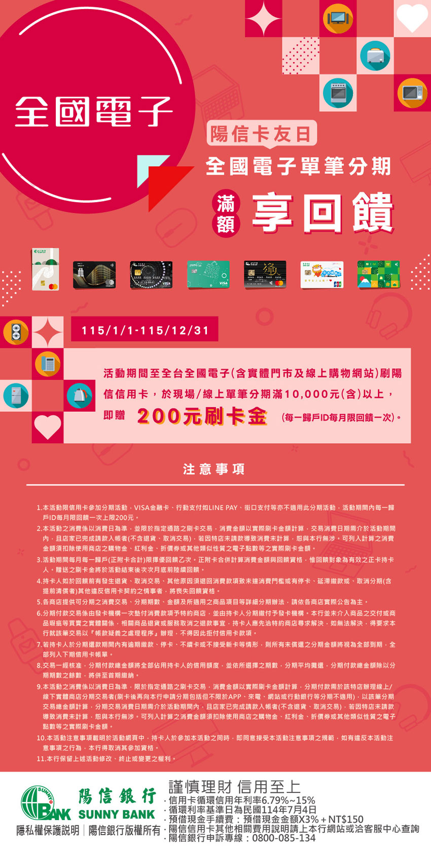115年 全國電子 陽信卡友日 單筆分期滿額享回饋