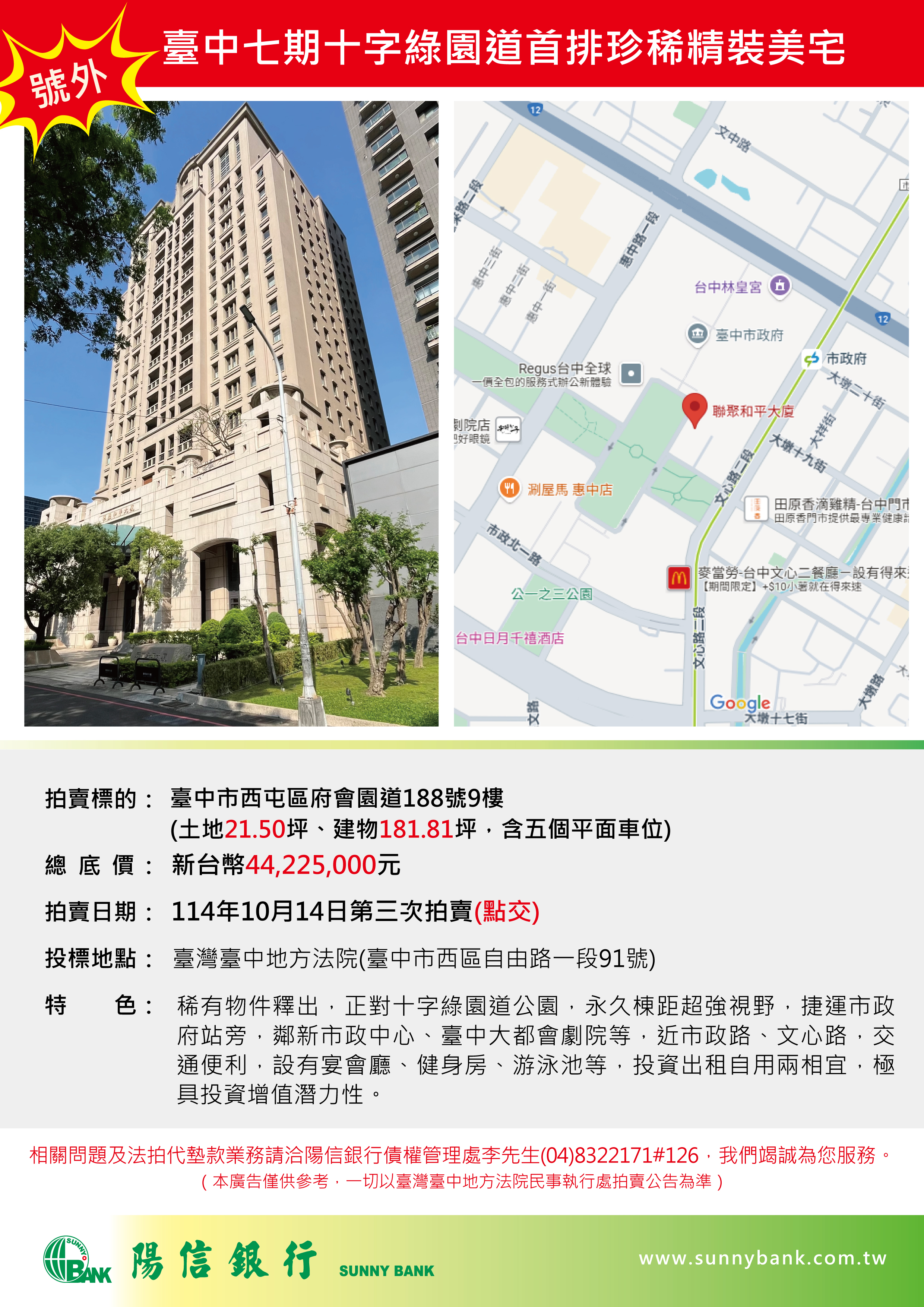 【法拍公告】臺中七期十字綠園道首排珍稀精裝美宅