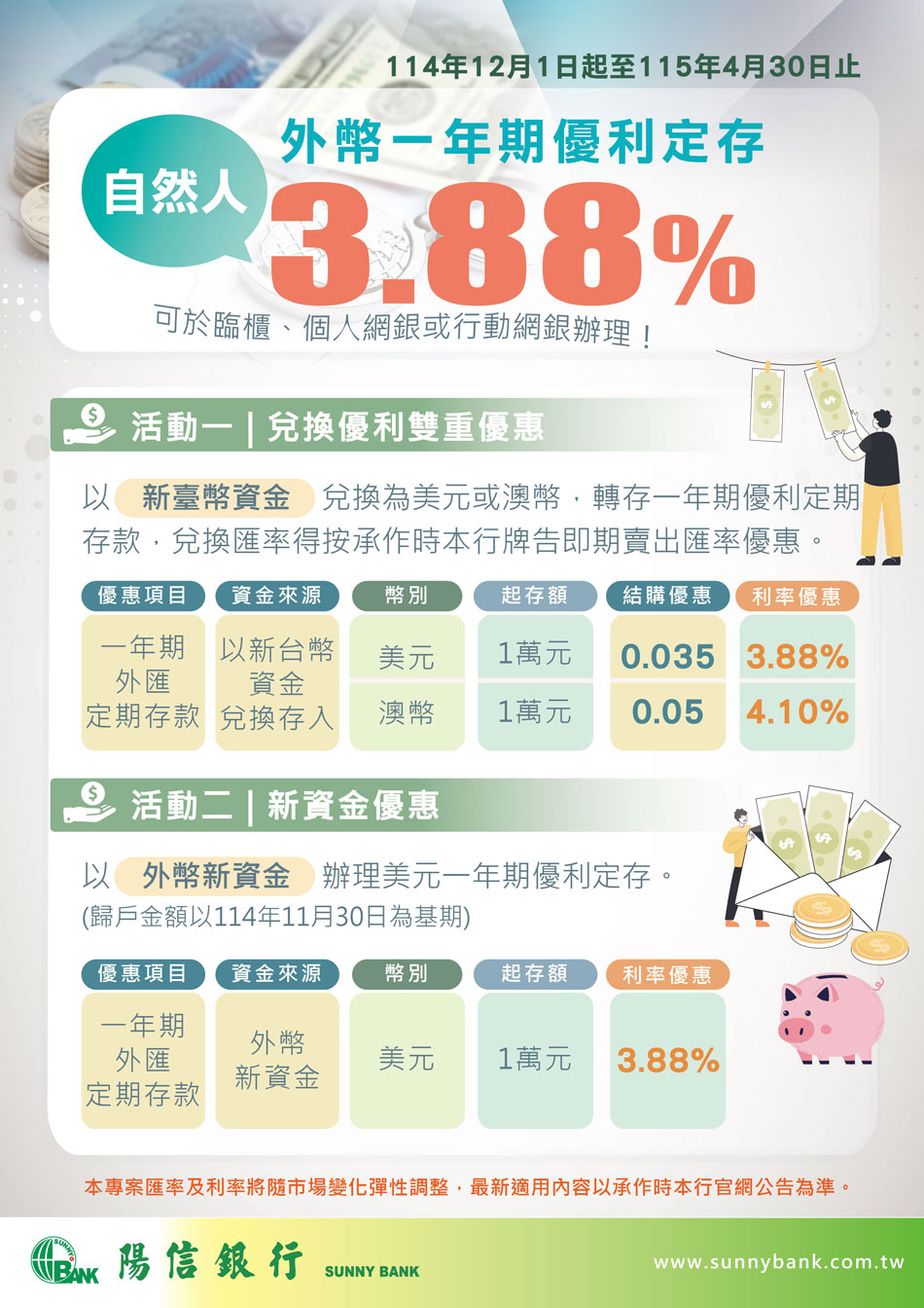 自然人外幣一年期優利定存3.88%,114年12月1日起至115年4月30日止,行動要快!